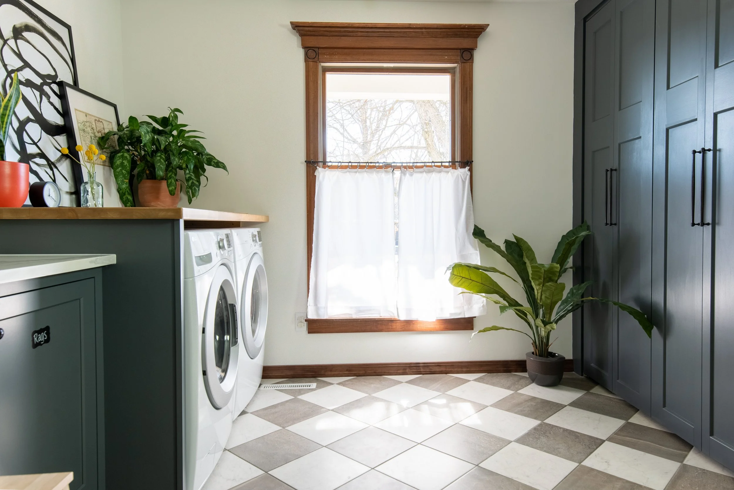 In this renovation, one of our priorities was storage, but of course I wanted it to be pretty. We didn't have budget for floor to ceiling cabinetry, so instead we used closets. We added a closet that shares a wall with the entry closet, and adjusted the existing closet right off the garage entry. I designed the closets with floor to ceiling doors, all painted the same color as the utility sink cabinets, to give everything the feel of cabinetry. Using floor to ceiling doors makes the closets SO much more functional and truly luxurious. How annoying is it to cram things up at an 8’ ceiling height inside a closet when the door is only 6.5’ tall? Another cost savings was that I was able to customize and install the interior closet system myself to meet our precise storage needs. At the end of the day, I'd say these closets have been even more functional than cabinets would have been.